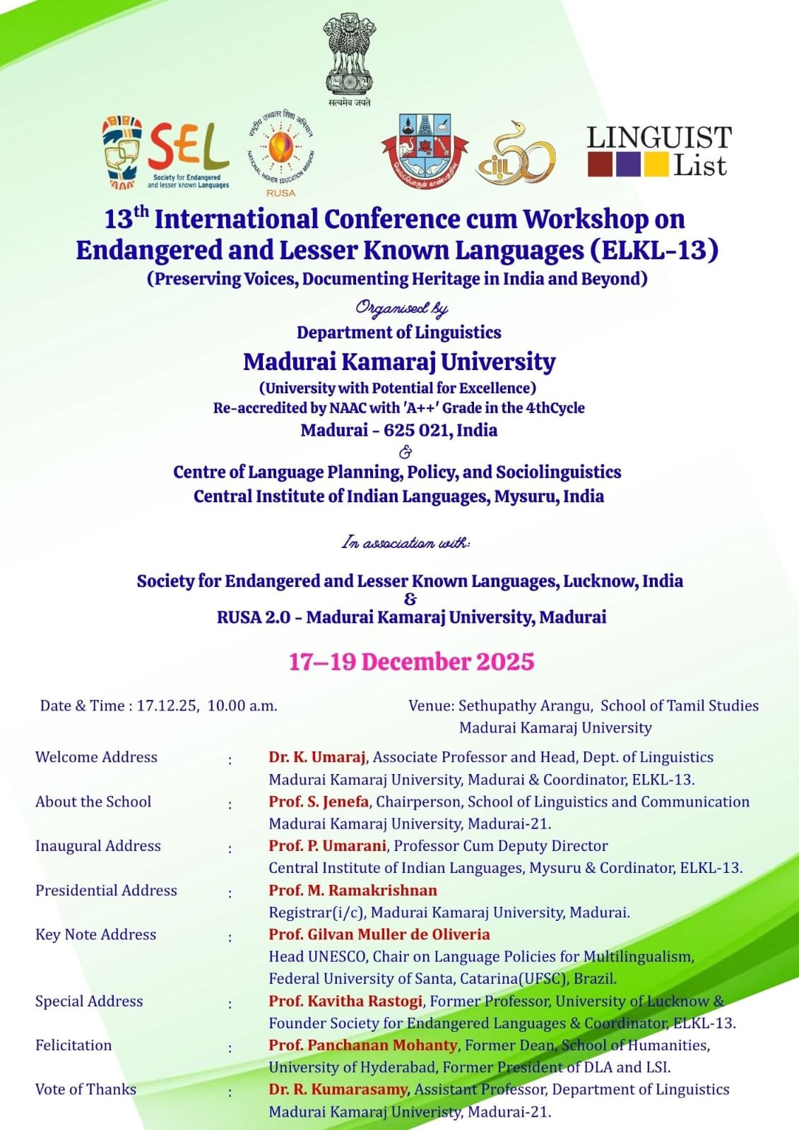 The 13th International Conference-cum-Workshop on Endangered and Lesser-Known Languages (ELKL-13) will be hosted by the Department of Linguistics, Madurai Kamaraj University (MKU), and organised in collaboration with the Centre of Language Planning, Policy, and Sociolinguistics (CLPP-Socio), Central Institute of Indian Languages (CIIL), Mysuru, in association with the Society for Endangered and Lesser-Known Languages (SEL). The ELKL series was initiated by SEL to promote international research and dialogue on endangered and lesser-known languages. The conference will provide a platform for sharing research on endangered and lesser-known languages with emphasis on documentation, revitalisation, sociolinguistics, language policy and planning, translation, and the role of AI and digital technologies. Comparative and international perspectives are encouraged. Keynote Speaker: Prof. Gilvan Müller de Oliveira, Head, UNESCO Chair on Language Policies for Multilingualism, Federal University of Santa Catarina (UFSC), Brazil Themes (indicative, not exhaustive): * Language documentation and description * Fieldwork methodologies and innovations in documentation * Typological and descriptive studies * Revitalisation, literacy, pedagogy, and intergenerational transmission * Sociolinguistic documentation, vitality, and ethnolinguistic vitality assessments * Language policy and planning * Translation, terminology, Indian knowledge systems, and knowledge transmission * AI and digital technologies * Digital archives, ethics, and accessibility * Interdisciplinary and applied perspectives.